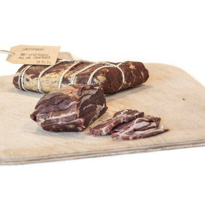Zutaten: Wildfleisch, Nitritpökelsalz, Wacholder*, Sellerie*, Rauch