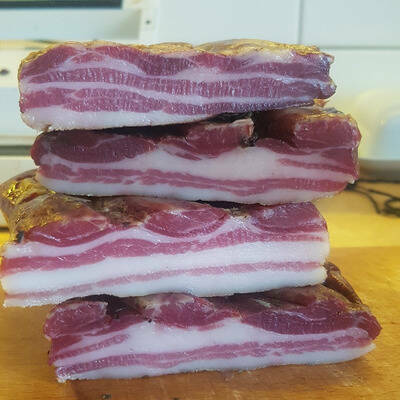 Zutaten: Wildschwein, Speisesalz, Pökelsalz, Gewürze, Sellerie, Rauch aus Buchenholz